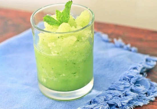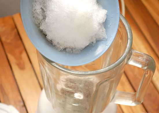 Bước 3: Dùng máy bào đá xay nhuyễn những cục đá to, sau đó múc phần đá bào đã xay xong vào máy xay sinh tố và xay đều hỗn hợp đến khi nhuyễn min thì ngừng lại. Cho ra ly thủy tinh, trang trí trên thành ly bằng 2 lát chanh, thêm lá bạc hà để trang trí và cắm ống hút xoắc ốc vào, thế là xong rồi đấy!